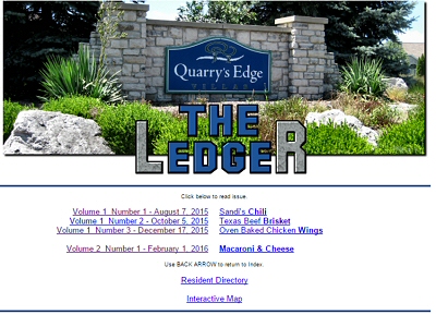 The LedgerTM is published on an "as needed" basis on behalf of Quarry's Edge Villas Condominium Association 6055 Quarry's Edge Lane, Sylvania, Ohio 43560 USA Copyright © 2016 - Quarry's Edge I, LLC - All Rights Reserved. Content may not be reproduced or retransmitted without consent. To UNSUBSCRIBE, write to MikeZets@gmail.com |